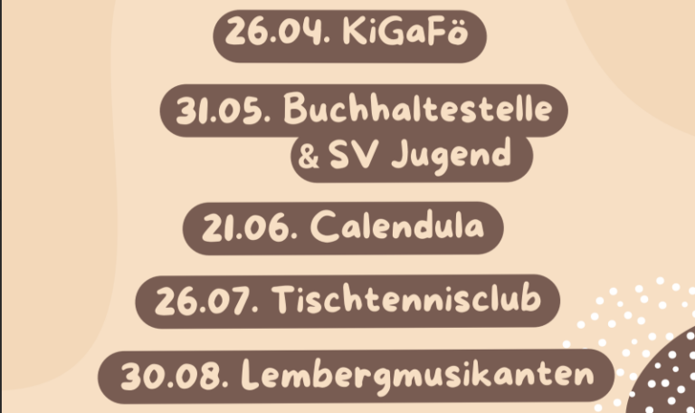 Pop-up-Café – Termine 2026 26.04. KiGaFö 31.05. Buchhaltestelle & SV Jugend 21.06. Calendula 26.07. Tischtennisclub