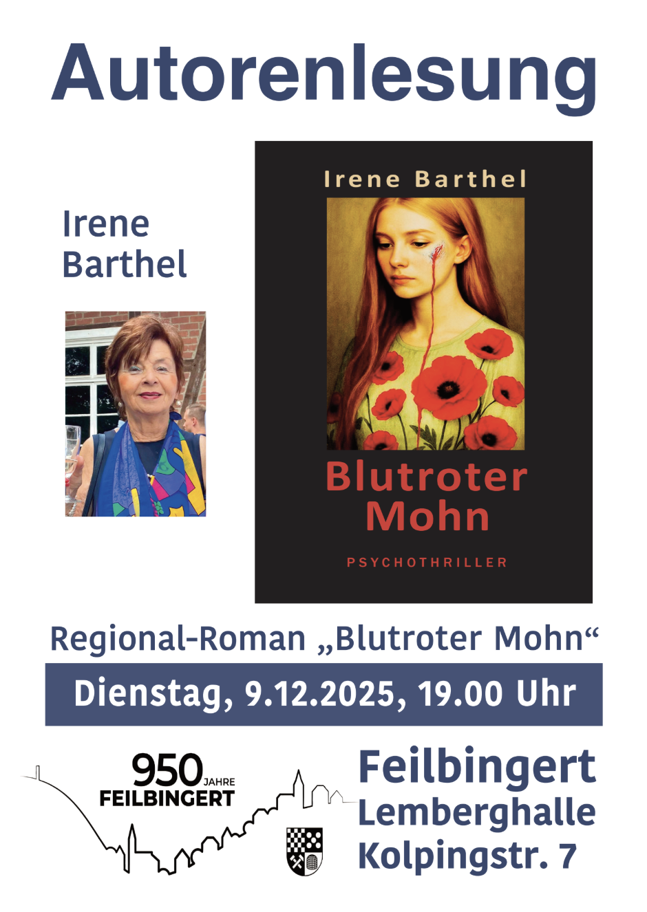 Irene Barthel liest … am Dienstag den 9.12.2025 um 19.00 Uhr in der Lemberghalle. Die in Bad Sobernheim geborene Autorin lebt seit vielen Jahren in Gutenberg und ist stark mit ihrer Heimat verwurzelt. Mit ihrem Kurzgeschichtenband „Einen Pulsschlag lang“ und ihren Regionalroman „Das Geheimnis der Pappeln“ besuchte sie uns bereits 2023. Ihren neuen Psychothriller „Blutroter Mohn“ stellte sie in einer Lesung auf dem Podium Rheinland-Pfalz auf der Frankfurter Buchmesse im Oktober diesen Jahres vor.